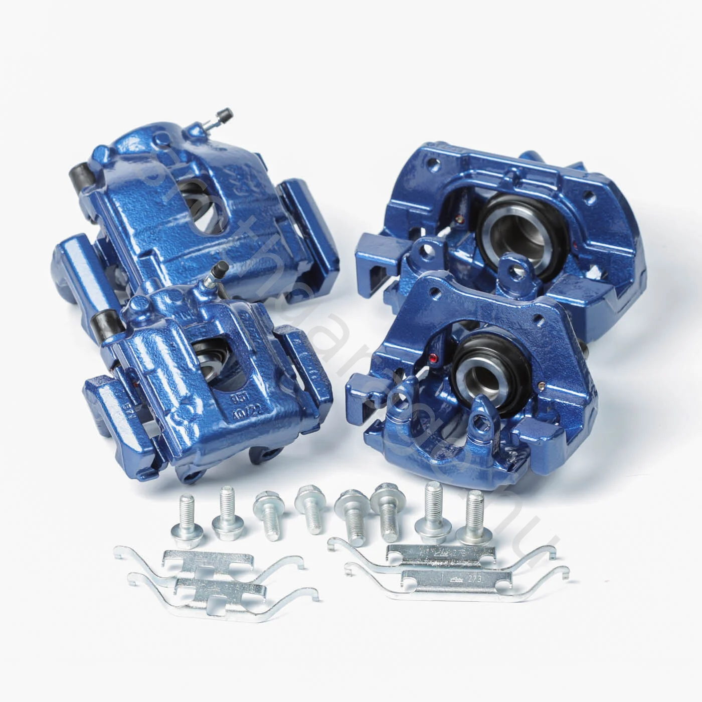 Féknyereg szett első-hátsó tengelyre Montecarlo Blau színben. Csavarokkal és fékbetét tartó lemezekkel.